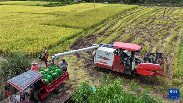 Des villageois utilisent une moissonneuse-batteuse pour récolter le riz au village de Xianyang, près de Nanping, dans la province chinoise du Fujian (sud-est), le 31 août 2025. À l'automne, les cultures de plusieurs régions du pays entrent dans leur saison de récolte, et les agriculteurs s'activent donc aux travaux agricoles. (Huang Jiemin / Xinhua)