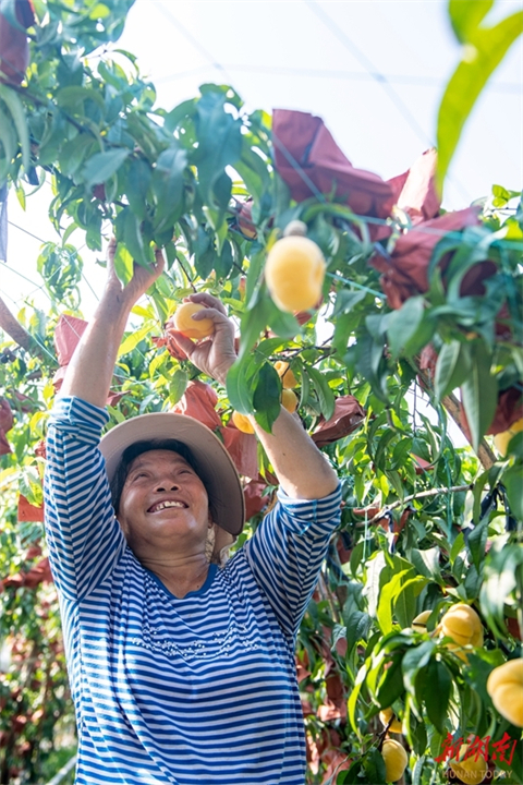 Récemment, au sein du verger intelligent du village de Huailiu, dans le bourg de Wanbao, district de Louxing, à Loudi, des fruiticulteurs étaient occupés à récolter des pêches plates. Ces dernières années, le district de Louxing, s'appuyant sur ses propres atouts, a activement exploré une voie de revitalisation rurale basée sur l'intégration urbain-rural et la convergence industrielle, formant ainsi un modèle industriel d' « Un village, une spécialité ». (Photo par WU Yonghua)