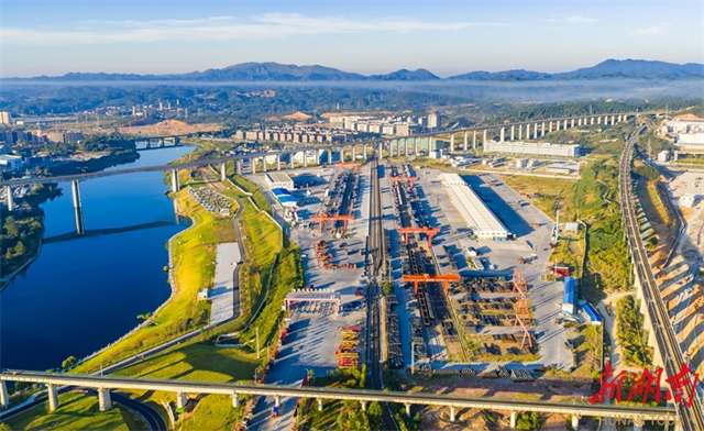 La photo aérienne, prise le 7 octobre, montre une scène animée d'une cour de marchandises au port terrestre international de Huaihua. Huaihua est membre du mécanisme de coordination et de coopération interprovincial « 13 + 2 » au sein du Nouveau corridor commercial terrestre et maritime international dans la région Ouest et constitue le seul centre de fret du Hunan relié à l'ASEAN. Acutuellement, le port terrestre international de Huaihua a établi sept principaux canaux logistiques internationaux, y compris le transport intermodal rail-mer du golfe de Beibu et les passages vers le Laos et le Vietnam. (Photo par TIAN Wenguo)
