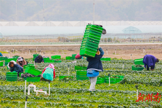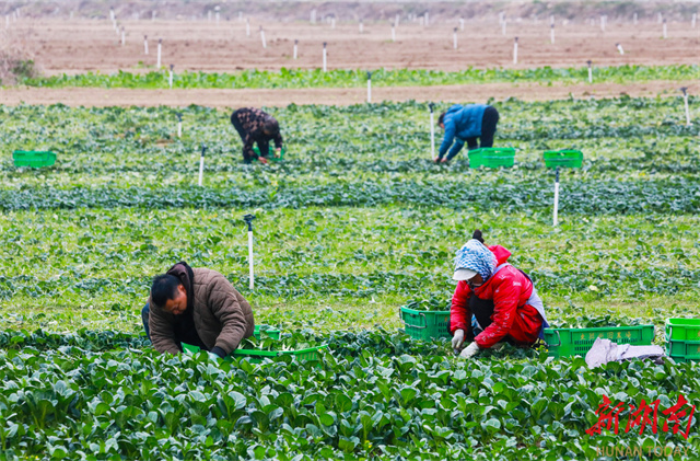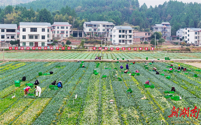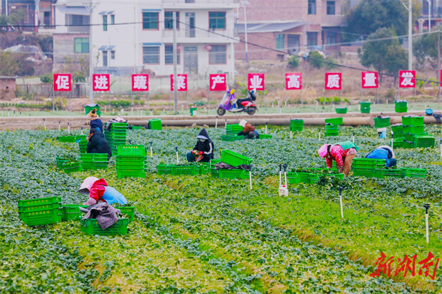 Récemment, dans le village de Gangshang, situé dans le quartier de Zhongshan du comté de Xintian, des villageois récoltent des légumes frais de saison. Ces dernières années, ce comté a pleinement exploité les avantages de ses terres riches en sélénium, s'est activement intégré dans le marché des légumes de la Grande Baie Guangdong-Hong Kong-Macao, et adopté le modèle de rotation « riz + légumes » pour développer vigoureusement l'industrie de la culture maraîchère hivernale, contribuant ainsi efficacement à l'augmentation de la productivité agricole et des revenus des agriculteurs. (Photo par LIU Guixiong)