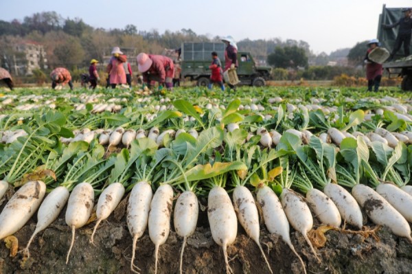 Le 18 décembre, dans la base de culture maraîchère écologique Xinyue située au bourg de Guanshi au district de Hengyang, des villageois récoltent des radis blancs. (Photo par LIU Xinrong)