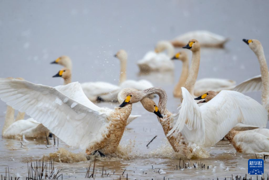 Photo prise le 4 décembre 2025 montrant des cygnes nageant sur le lac Donggu. (Zhou Yang / Xinhua)