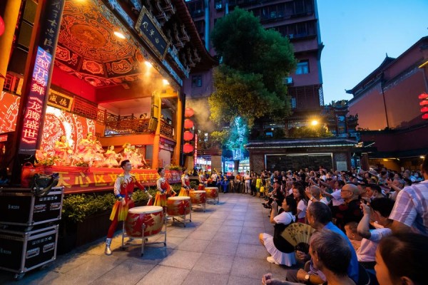 Des spectateurs assistent à un spectacle sur la scène du Palais du feu, dans la rue Pozi à Changsha, capitale de la province chinoise du Hunan (centre), le 21 mai 2021. (Photo : Chen Sihan)