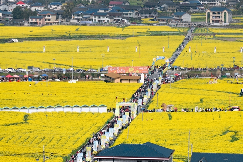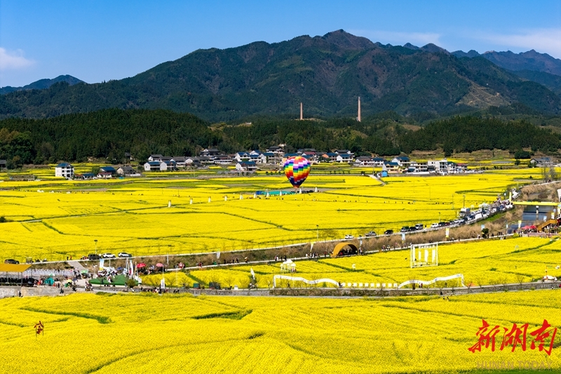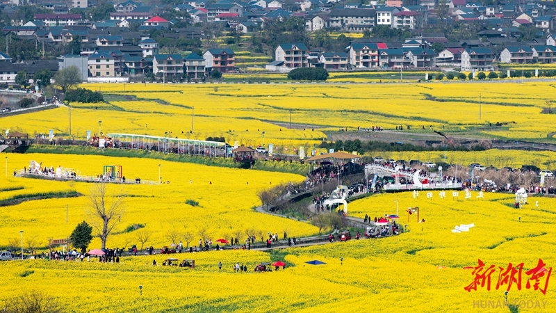 Récemment, le Festival des Fleurs du colza du Hunan 2026 a ouvert ses portes dans la zone touristique des rizières, située au bourg de Baozi du district de Huitong à Huaihua. Actuellement, en pleine floraison du colza, des mers de fleurs dorées dans diverses régions du Hunan ont attiré un nombre de touristes pour visite et promenade printanière. (Photo par ZHANG Lei)