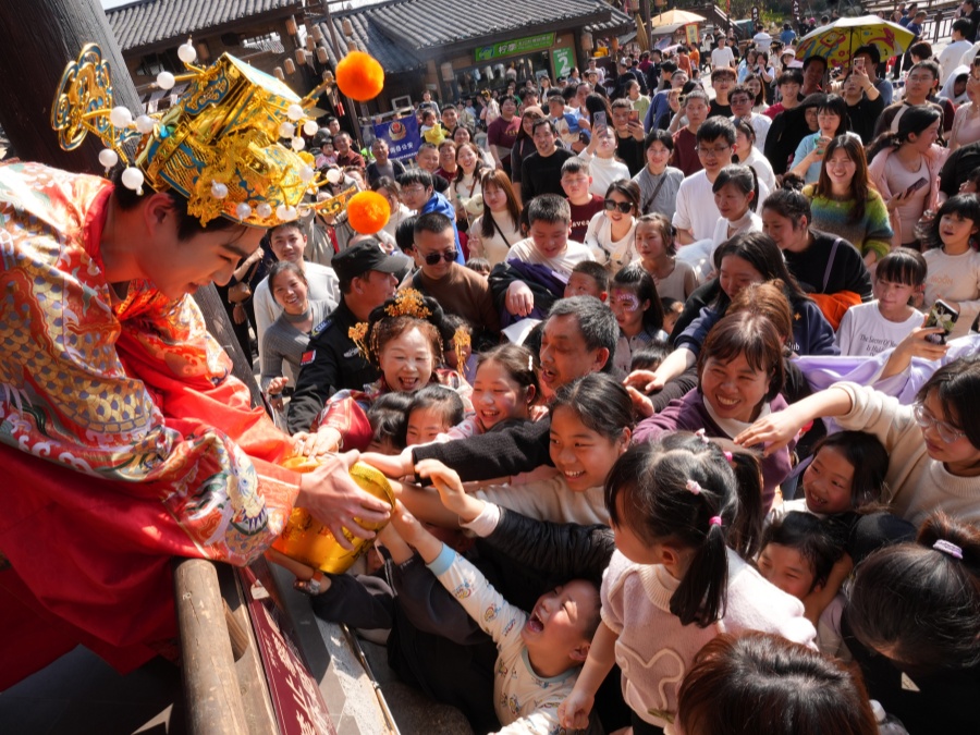 Dans le district de Nanyue, sur le mont Heng (Hengshan) à Hengyang, un acteur interagit avec des visiteurs. Pendant les vacances du Nouvel An chinois, ce district a organisé des activités folkloriques variées, offrant aux visiteurs une expérience de la Fête du Printemps imprégnée de traditions. (Photo par CAO Zhengping)