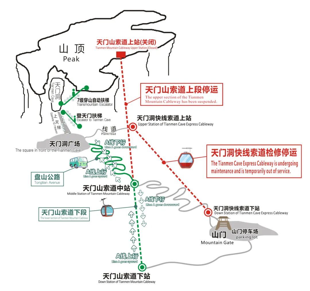 Pendant la maintenance, le site touristique du Mont Tianmen ne fera fonctionner que la ligne A du téléphérique aller-retour. Les billets aller-retour pour les lignes B et C du téléphérique, ainsi que les billets aller simple pour les lignes 1 et 2, ne seront plus disponibles. Les billets aller-retour pour la ligne A du téléphérique seront vendus de 6h30 à 16h00, avec des départs à partir de 7h00.