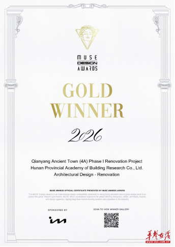 Les MUSE Design Awards, souvent surnommés les « Oscars du design », ont récemment annoncé leurs lauréats pour 2026. Le « Projet de conservation de la phase I de la ville ancienne de Qianyang (4A) » s'est distingué parmi plus de 6 300 candidatures provenant de 46 pays à travers le monde et a remporté le Prix d'Or. Ce projet a été conçu par la SARL de l'Académie provinciale de recherche en bâtiment du Hunan, une filiale du Groupe d'investissement en construction du Hunan.